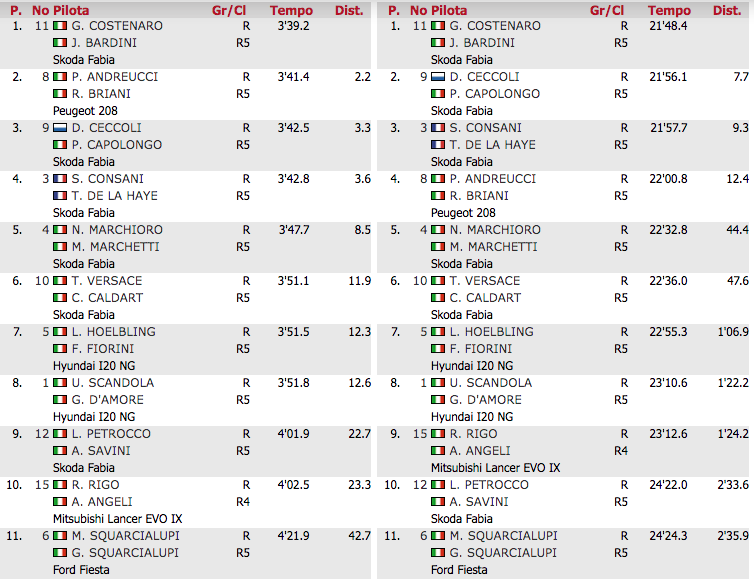 Paolo Andreucci cerca di restare attaccato al treno dei primi e sulla Lunano stacca il secondo tempo a soli 2,2 da Costenaro. Il pilota Peugeot al momento è in quarta posizione a 12,4 dalla testa. Da Andreucci si apre un buco importante che trova Nicolò Marchioro ad oltre 40 secondi, seguito da Tullio Versace. L’altra Hyundai i20 di Luca Hoelbling paga oltre un minuto.