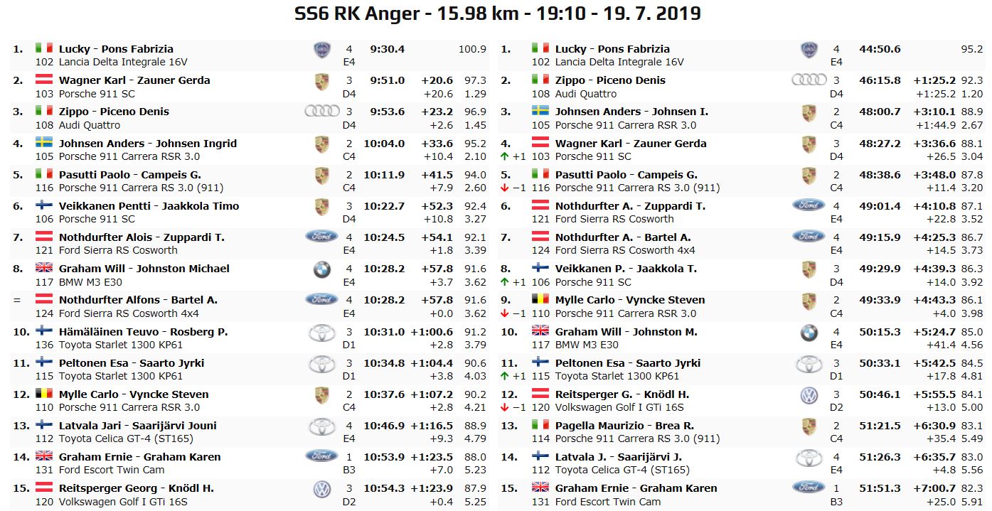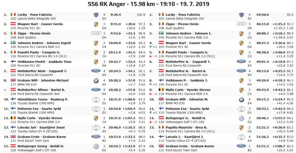 Secondo posto provvisorio (primo di terzo raggruppamento) per la sempre elegante Audi Quattro portata in gara da Andrea “Zippo” Zivian e Denis Piceno, i quali dopo lo sfortunato Ypres stanno conducendo gara regolare confermandosi sempre nelle posizioni di testa, nonostante il ritardo di 1’25.2 dalla vetta, completando un momentaneo 1-2 tutto tricolore. Al terzo posto per ora si trovano gli svedesi Anders ed Ingrid Johnsen, a bordo della loro Porsche 911 RSR, staccati però di ben 3’10 da Lucky-Pons alla loro prima volta austriaca.