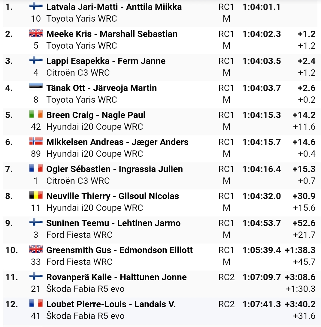 Si conclude qui questa giornata spettacolare con la prova spettacolo, andata già in scena ieri. E proprio come ieri a staccare il miglior tempo è il belga Thierry Neuville che precede Ogier Meeke a pari merito. Seguono Tanak, Mikkelsen e Lappi, che conclude in seconda piazza. Poco cambia nella classifica Wrc2 e Wrc2Pro con Loubet e Rovanpera che terminano la giornata in netto vantaggio rispetto gli altri.