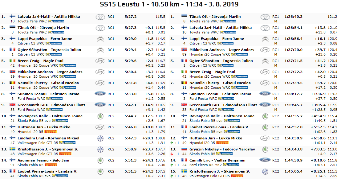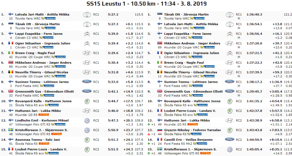 La mattina si chiude con la prova n.15. Ancora le Toyota Yaris a farla da padrone con Latvala che vince la prova essendo più veloce di un piccolo decimo del compagno Ott Tanak, sempre leader della gara. Lappi è terzo di rpvoa e di generale. Si riaffaccia nelle zone alte anche Seb Ogier, quarto con un buon tempo. Mentre quinto si è piazzato il rientrante Craig Breen che attualmente, alla guida della Hyundai i20 è sesto a 42 secondi dalla testa.