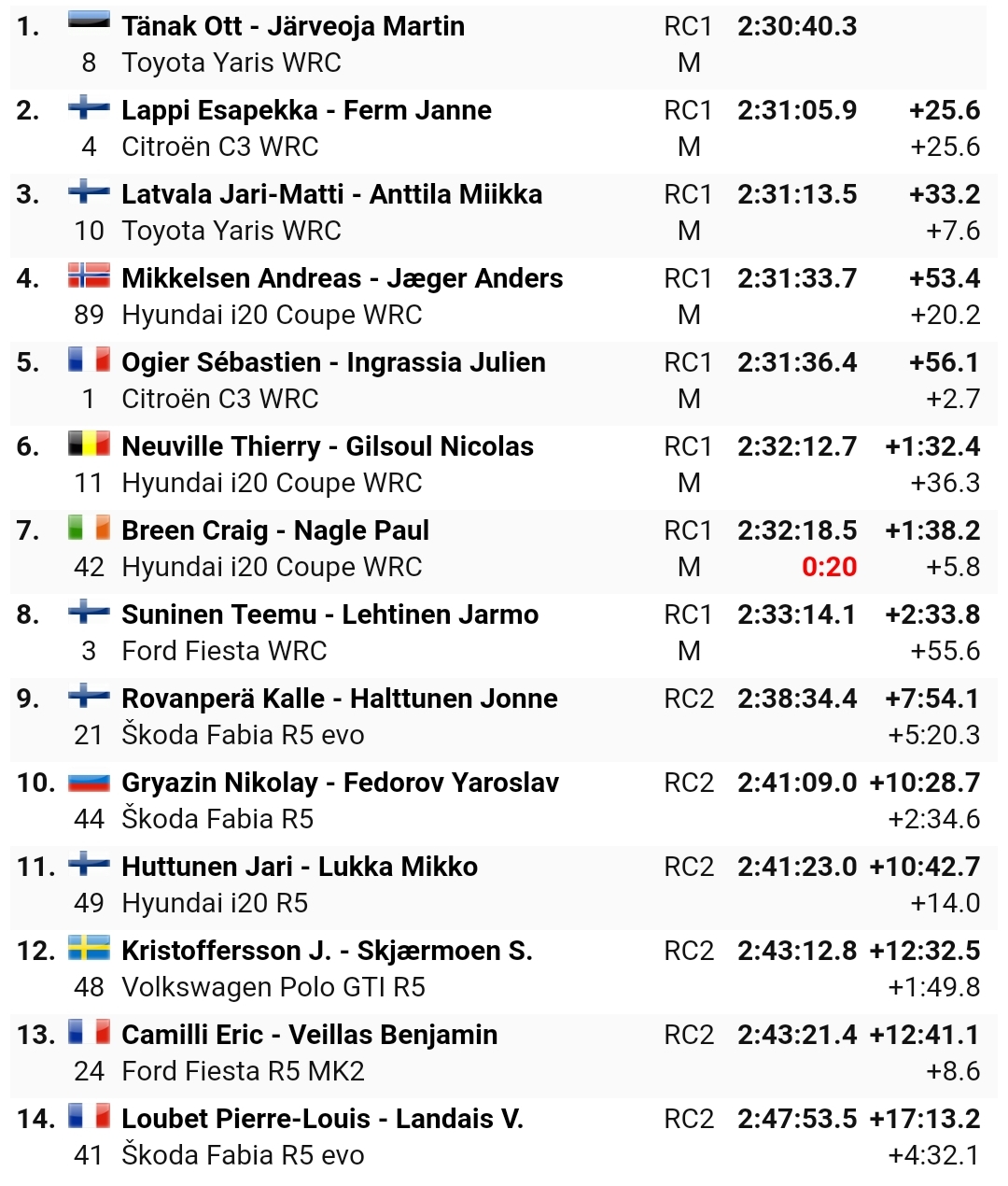 Siamo arrivati ufficialmente alla conclusione di questo Rally di Finlandia che ha visto trionfare Ott Tanak mettendo a segno un vero e proprio capolavoro davanti ai piloti di casa Esapekka Lappi e Jari-Matti Latvala, buon successo per loro che li riscatta dopo delle prove poco convincenti sin qui. Nel Wrc2 Gryazin vince davanti all’uomo di casa Huttunen e Kristoffersson, mentre nel Wrc2Pro 4 vittoria stagionale per Kalle Rovanpera che dilaga in lungo e in largo vincendo tutte le stage della gara davanti al francese Eric Camilli.