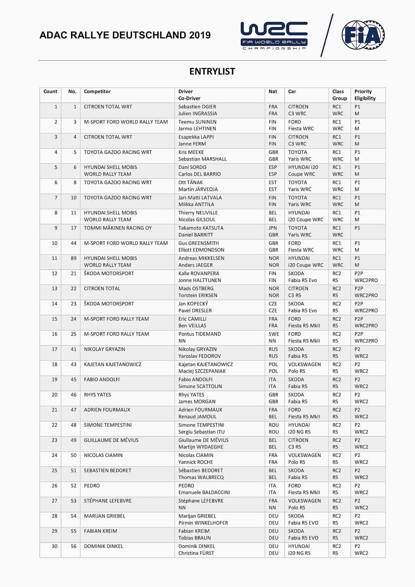 Tra le vetture RC1, ovvero le WRC+, curiositĂ per il debutto di Takamoto Katsuka che porterĂ in gara la Toyota Yaris WRC+. Per quel che riguarda confermate le varie line-up annunciate alla vigilia tutto come previsto con la conferma Greensmith e Hyundai senza Loeb.