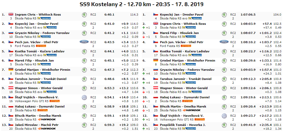 Nel secondo loop di prove ecco le carte si rimescolano per quanto concerne le prime posizioni. La bagarre fra i due russi e il ceco sulla Fabia è a dir poco emozionante, scambiandosi lo scettro di vincitori di stage uno con l’altro, ma il colpo di scena arriva nella PS8 Halenkovice 2 nella quale Aleksey Lukyanuk fora e perde numeroso terreno. Il pilota russo sembrava poter proseguire da una foratura lenta ma la sospensione danneggiata lo obbligava a ritirarsi.