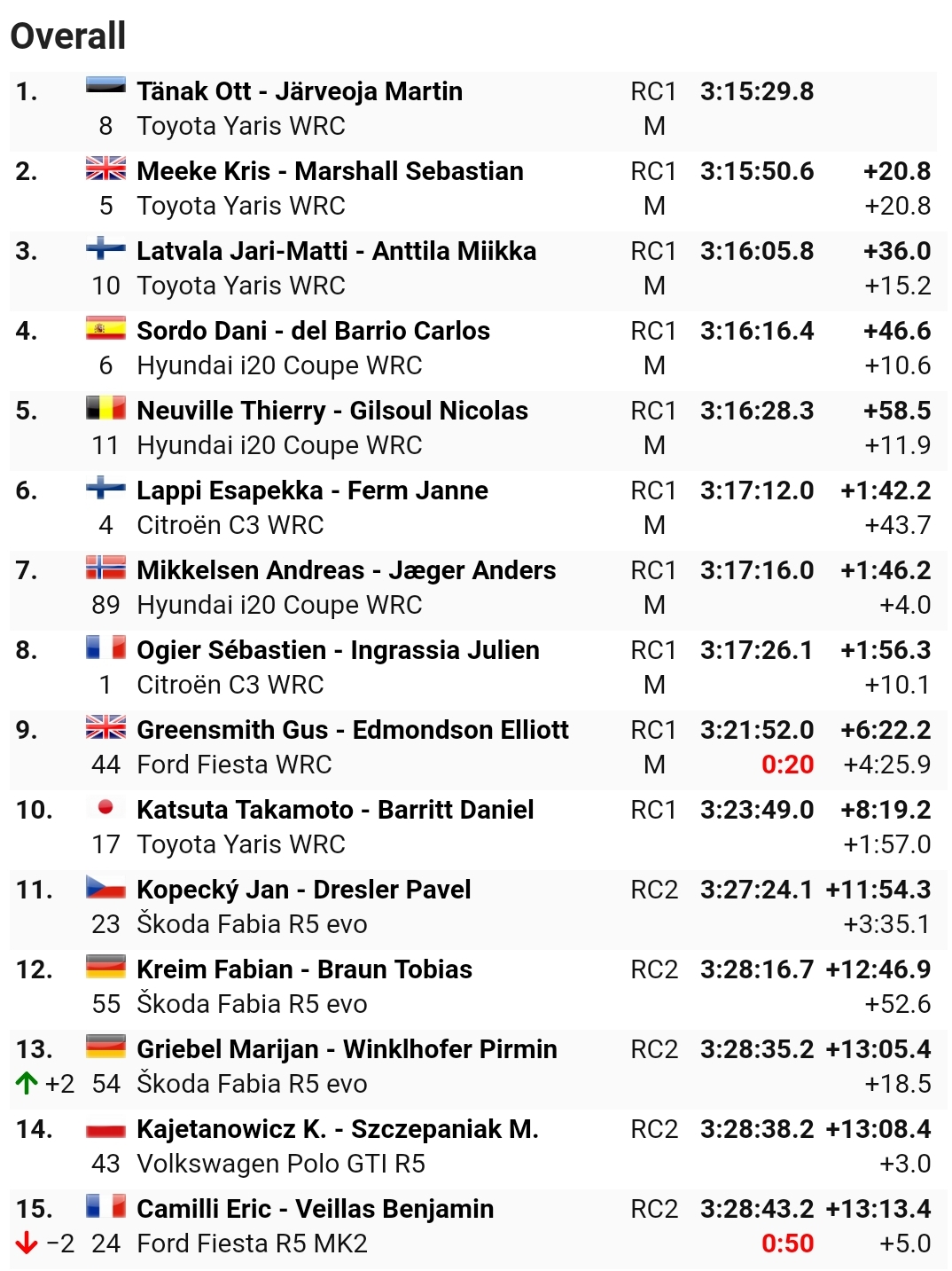 Nella categoria Wrc2Pro Jan Kopecky centra il successo frenando così la serie positiva di Kalle Rovanpera che si deve accontentare di un terzo posto alle spalle del francese Eric Camilli. Classifica Wrc2 nelle mani di Fabian Kreim, seconda piazza per il connazionale Marijan Griebel davanti al polacco Kajto