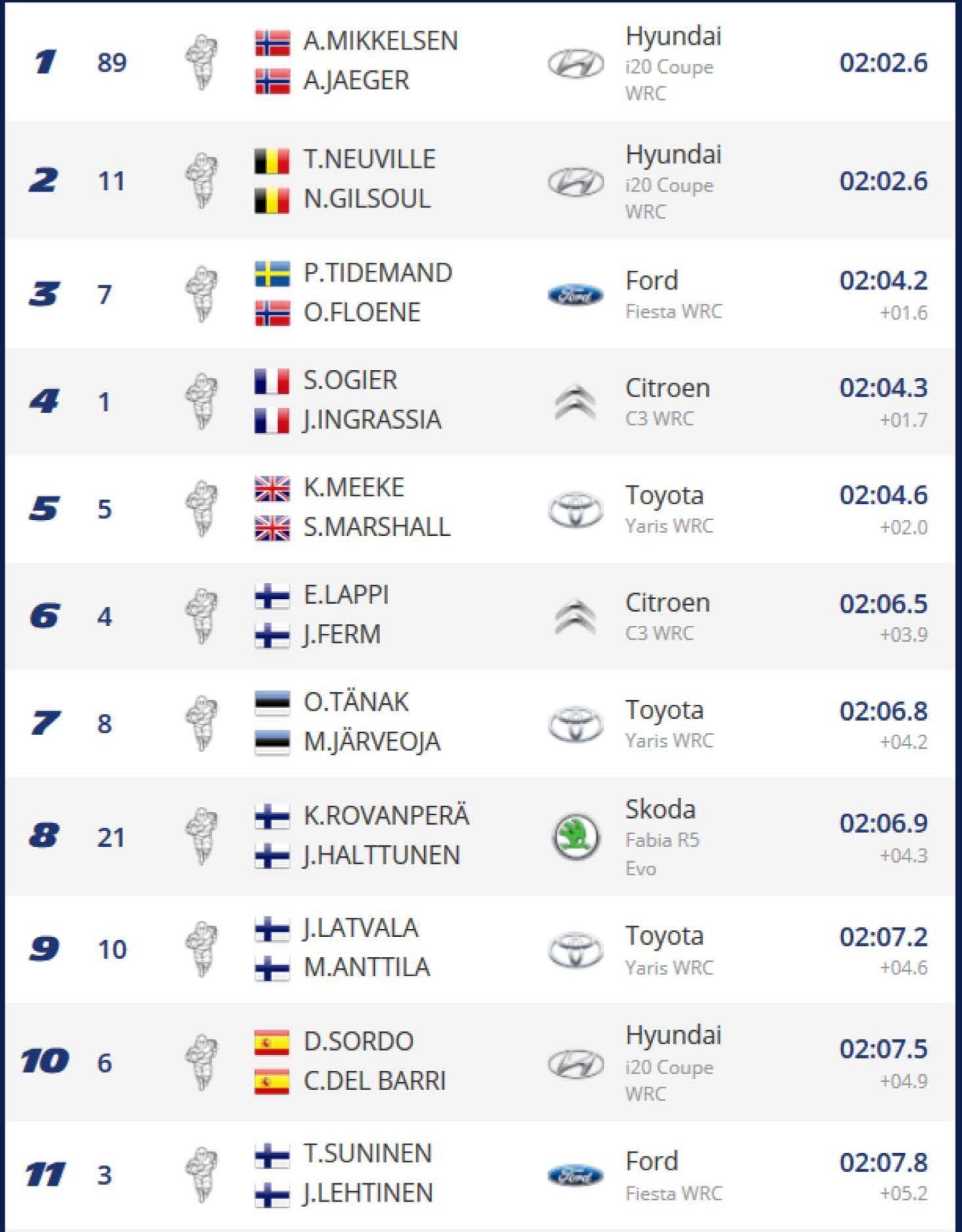 I due alfieri Hyundai Motorsport hanno completato la prova segnando il medesimo tempo, staccando di 1″6 Pontus Tidemand al rientro nel WRC con la Ford Fiesta WRC+. Quarto tempo per Sebastian Ogier attardato di 1″7, quinto Crono per Kris Meeke, che come allo shakedown risulta al momento il più veloce con le Toyota Yaris WRC.