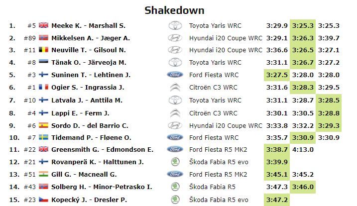 Il leader della classifica generale Ott Tanak conclude col quarto tempo davanti al finlandese di M-Sport Teemu Suninen, il quale ha dimostrato di trovarsi molto bene concludendo con un buono split. Faticano, ma questo si sa già da tempo, le Citroen di Ogier e Lappi che concludono rispettivamente sesto e ottavo con in settima piazza Jari-Matti Latvala. Dani Sordo nono mentre ritorno in grande stile per lo svedese Pontus Tidemand che cercherà di maturare più esperienza possibile dopo l’avvio al Rally di Monte Carlo sulla Ford Fiesta Plus griffata M-Sport.