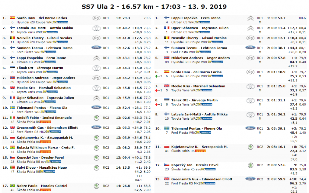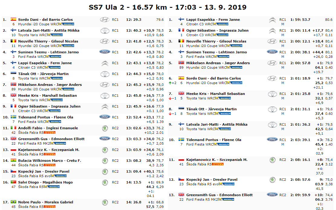 La giornata di chiude con la prova n.7. Miglior tempo da chi non ti aspetti, vince infatti Dani Sordo a bordo della sua Hyundai i20 WRC con un gran bel tempo. Alle sue spalle, con oltre 10 secondi di ritardo c’è Jari-Mati Latvala che chiude secondo e il compagno Thierry Neuville. Quarto e quinto tempo per Suninen e Lappi. Resta comunque tutto invariato nella classifica generale. Solo lo spagnolo, vincitore della prova, guadagna una posizione ai danni di Kris Meeke e Ott Tanak.