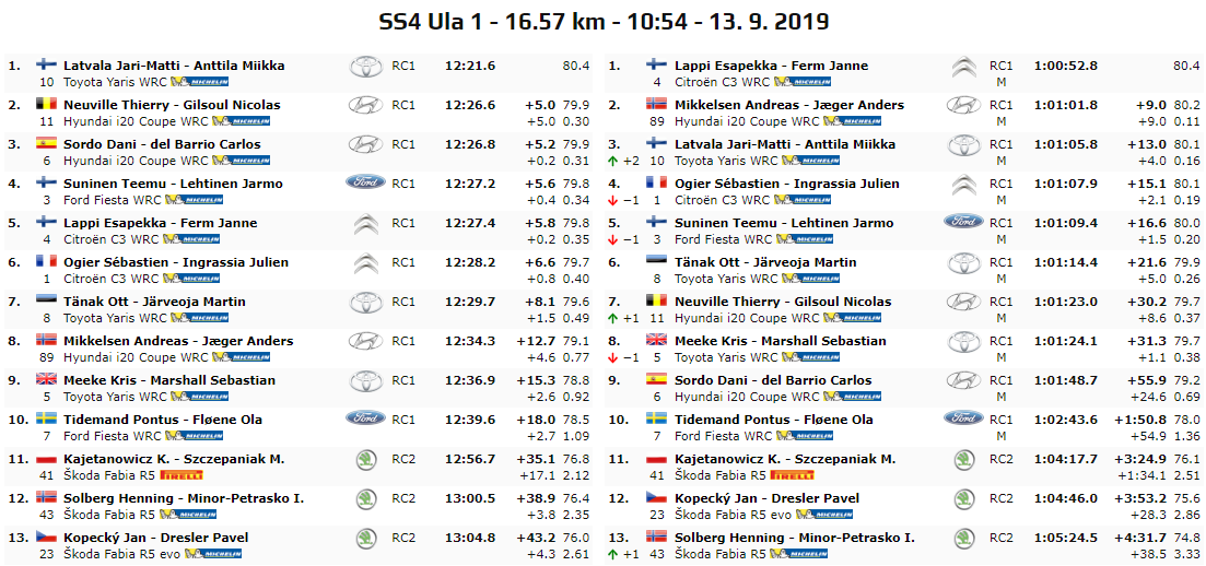 Latvala torna ad assaporare i vertici della classifica e lo fa stabilendo il tempo migliore in questa prova, davanti a Thierry Neuville e Dani Sordo, prova che anche le Hyundai vogliono essere della partita. Suninen buon tempo in quarta piazza davanti al leader della classifica provvisoria Esapekka Lappi che gestisce. Le parole del leader: