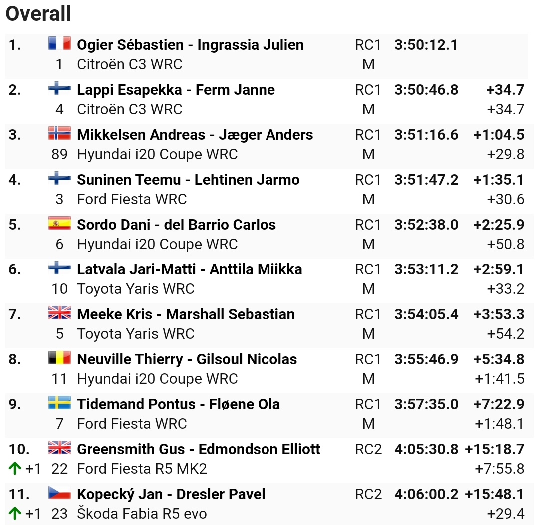 Tirano solo quelli dietro, più per lo spettacolo per la classifica, e il focus è ormai solo sugli ultimi chilometri che verranno tra poco. Teemu Suninen perde alcuni elementi aerodinamici sulla prova precedente e lascia altro margine a Mikkelsen che vede consolidarsi il suo terzo posto. Colpo di scena tra le prime file com EP che è vittima di un testacoda ma rimane ampiamente in vantaggio sul norvegese con Ogier che allunga sul finlandese. Nel Wrc2Pro Greensmith si capotta ma prenderà comunque parte alla PowerStage