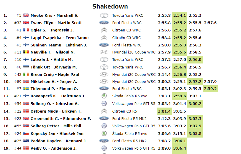 A parimerito il compagno di squadra Esapekka Lappi, quinto il connazionale Teemu Suninen. In sordina le vetture di Neuville, Latvala e Tanak, mentre chiudono la top10 il due Hyundai Breen/Mikkelsen.