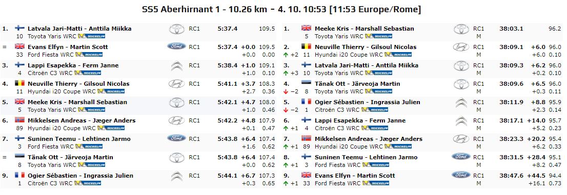 Segue il terzetto finnico composto da Lappi, Suninen e Latvala, quest’ultimi due a parimerito. Chiudono la top10 Breen, Neuville, che si fa soffiare la seconda piazza temporanea, il compagno di squadra Mikkelsen e Greensmith, che vince la stage nel Wrc2Pro. Wrc2 nel segno di Veiby, mettendosi alle spalle Loubet ed Heller, settimo Andolfi. Junior dominato da Solans, Radstrom si ferma, Oldrati chiude col sesto tempo.
