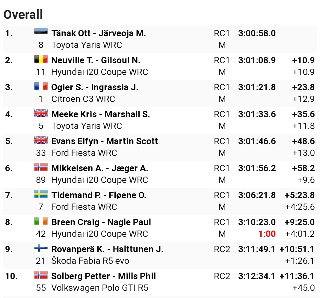 Ci si sposta a Brening per la consueta PowerStage nella quale Kalle Rovanpera conquista il titolo Wrc2Pro, grande trionfo per il pilota finlandese che sarà la voce più discussa del prossimo mercato Wrc, mentre Petter Solberg saluta il popolo del mondiale rally con una vittoria memorabile nel Wrc2 dopo i tanti successi conquistati, oltre il mondiale vinto nel 2003. Nella categoria maggiore Ott Tanak vince sul velluto, davanti a uno splendido Ogier per soli 5 decimi. Bellissima prova per Lappi ch conquista 3 punti, mentre Neuville chiude quarto davanti ad un ottimo Evans.