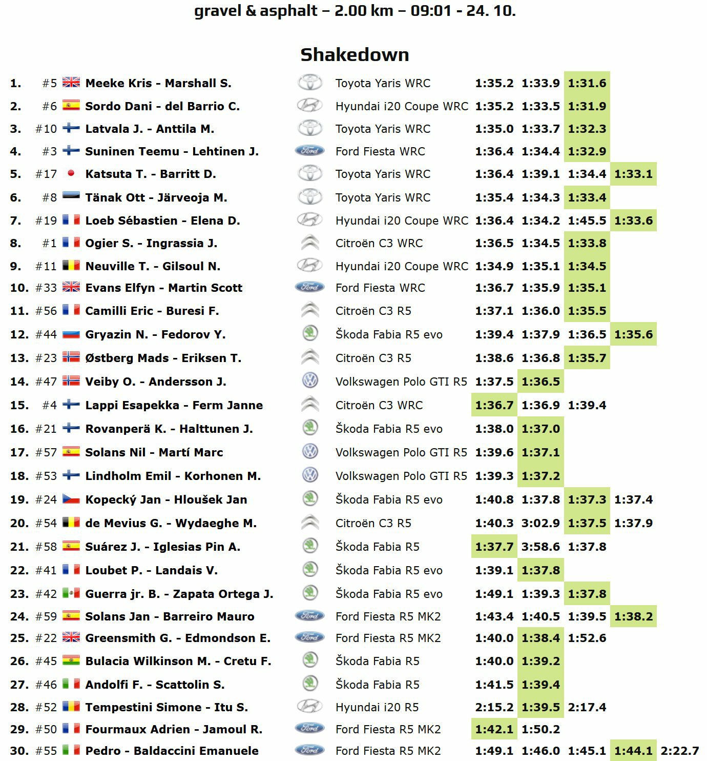 Nei 2 km di prova misto terra-asfalto, il pilota Toyota è il più veloce di tutti, precedendo di appena tre decimi lo spagnolo Dani Sordo al volante della Hyundai I20 WRC+. Terzo tempo per Jari Matti Latvala staccato di sette decimi.