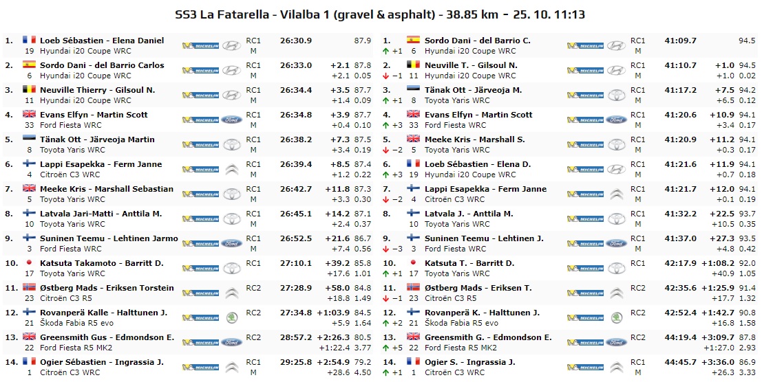 La classifica generale si muove perchè, grazie all’ottimo secondo tempo, lo spagnolo di casa balza in testa alla gara. Guadagna il podio anche Ott Tanak che sale al terzo posto dietro a Neuville. Scambio di posizioni anche