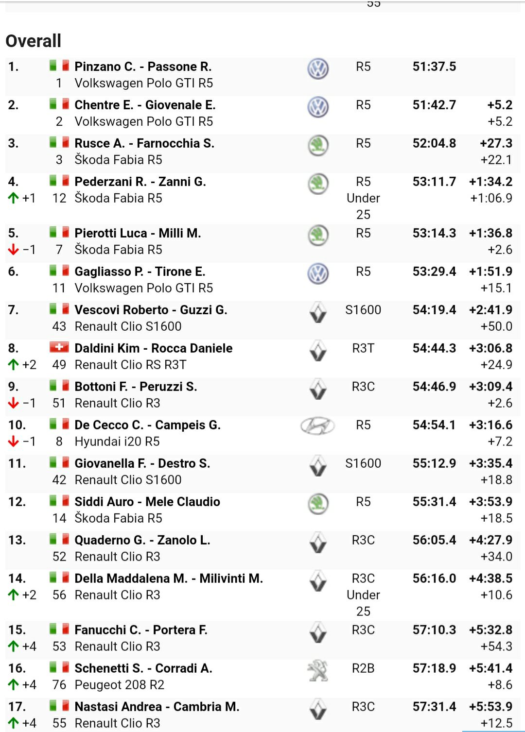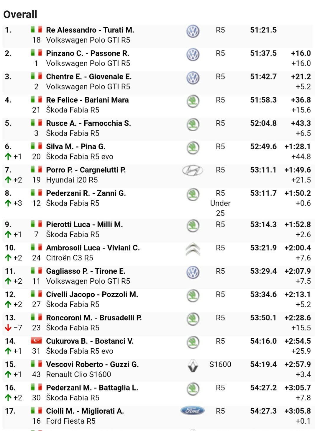 Grande prestazione per il varesotto Riccardo Pederzani, che sorride per il primato ottenuto nella classe Under 25 affiancato da Gabriele Zanni con la Skoda Fabia R5. Soddisfazione anche per il lucchese Luca Pierotti e Manuela Milli con un’altra Fabia R5, per il parmense Roberto Vescovi e Giancarla Guzzi primi nella classe S1600.