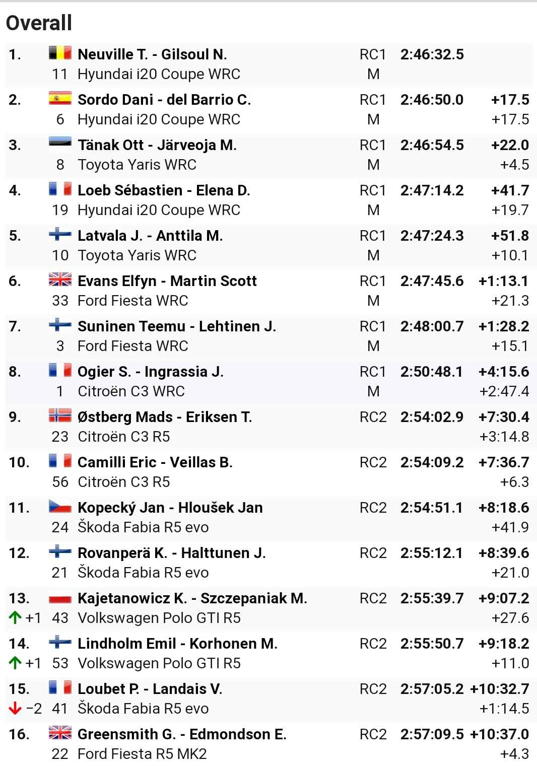 Alle spalle dell’estone i due inglesi Evans e Meeke, quest’ultimo rientrato col Super Rally. Chiudono la top10 Ogier, oramai rassegnato, nelle retrovie della classifica, i due finlandesi Latvala e Suninen, infine Loeb e Katsuta.