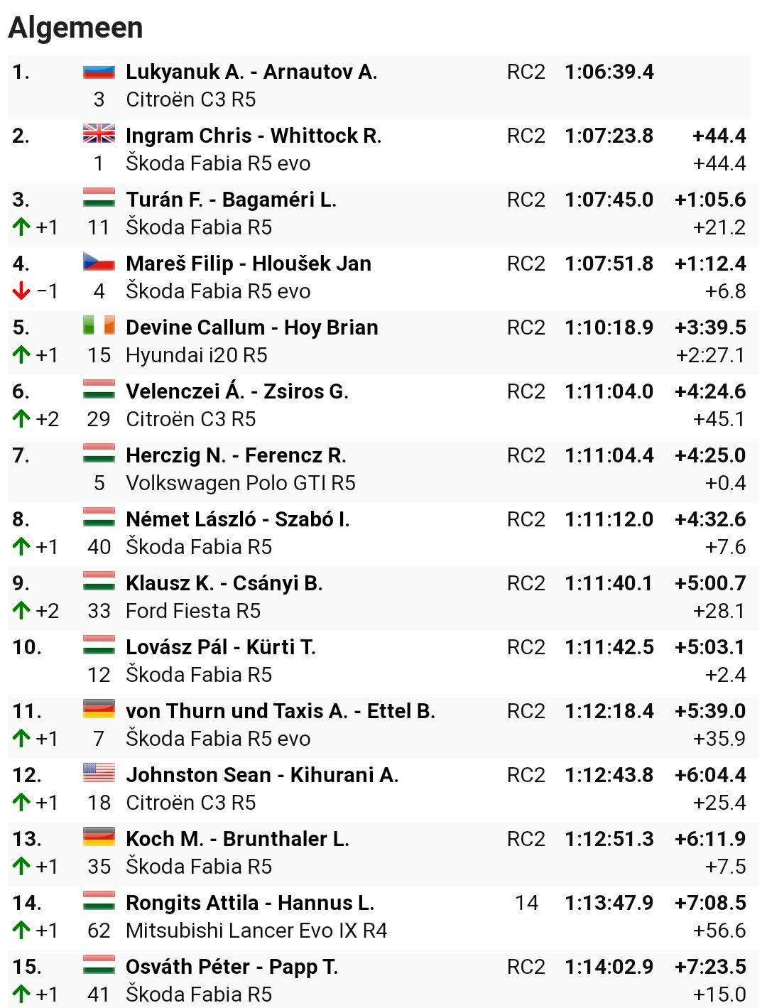 Terzo gradino provvisorio per il locale Túran sulla Skoda Fabia R5 che nel finale scavalca il ceco Mares attardato anche lui da una foratura e da un lungo nel corso dell’ultima prova di giornata. Quinto posto per l’irlandese Devine sulla Hyundai I20 R5.