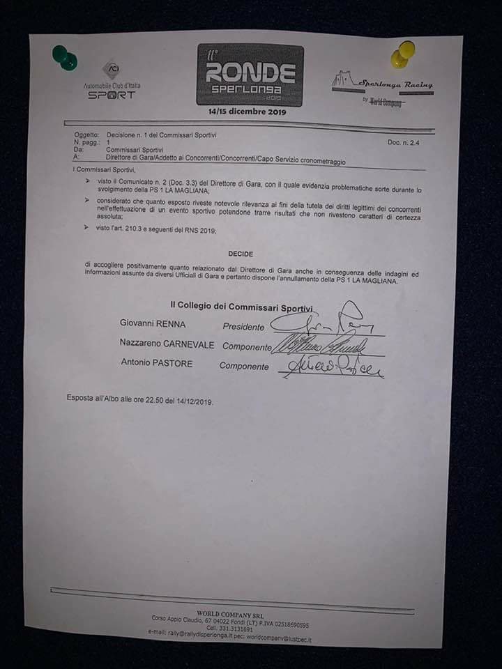 Sperlonga Racing comunica che l’annullamento della Prova Speciale numero 1, disputata dalle ore 18,10 di ieri, sabato 14 dicembre, è stata causata da problemi legati al servizio di cronometraggio ed alla logistica ad esso riferita. In ragione di questo, il Collegio dei Commissari Sportivi, sulla base dell’articolo 210.3 e seguenti del regolamento Sportivo Nazionale 2019, oltre che su quanto relazionato dal Direttore di Gara, ha deciso di annullare la prova speciale.