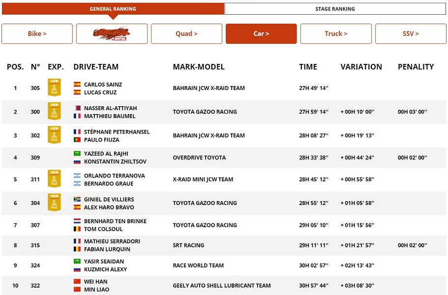 In mezzo ai due piloti Mini, Nasser Al-Attiyah ha cercato di limitare i danni, contenendo il suo svantaggio di tappa in 2 minuti e 12 secondi e consolidando il suo secondo posto anche nella generale, a 10 minuti esatti da Sainz. A seguire segnaliamo ottime prestazioni di giornata anche per Ten Brinke, Al Rajhi e Alonso. L’asturiano è di gran lunga il miglior rookie di questa Dakar e, prova dopo prova, continua a migliorare le sue prestazioni e a sorridere sempre di più ad ogni fine tappa, segno che questa nuova avventura lo sta conquistando!