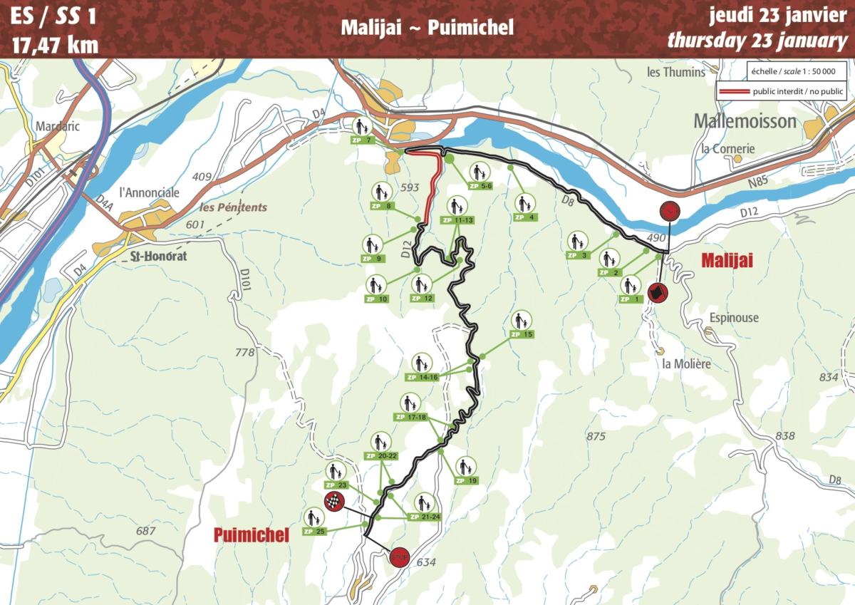 La prima parte di prova, circa 5 chilometri è relativamente veloce con ampi tratti dritti, questa parte di prova nella zona di Chaffaut è inedita. Il resto della prova è simile al tratto usato negli anni ’80/’90 (dal 1988 al 1994), con passaggio sul Col de Puimichel (807 mt) caratterizzato da una strada in salita, subito dopo la strada diventa piĂą scorrevole con tratti veloci e poco tortuosi