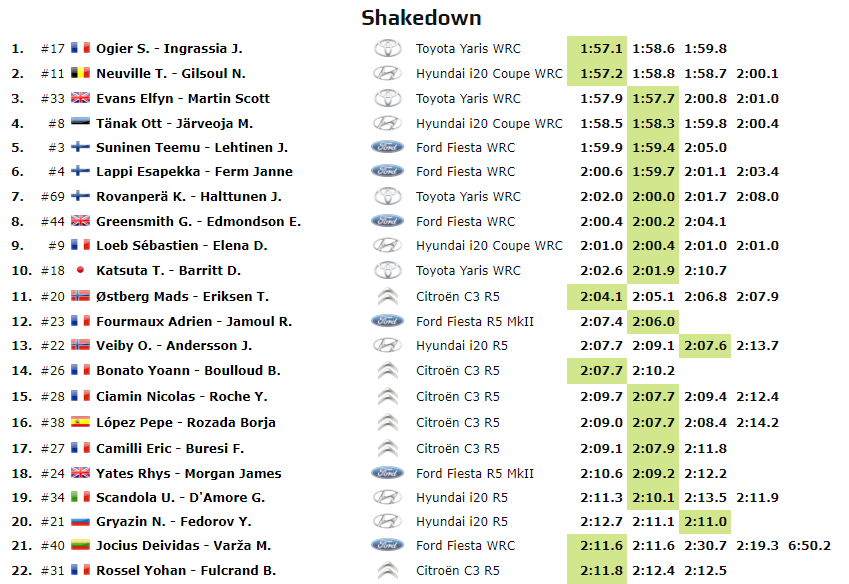 Il francese alla prima uscita ufficiale con la Toyota ha preceduto il rivale Thierry Neuville su Hyundai di 0.1 secondi. Dietro di loro Evans con l’altra Toyota staccato di 0.6 secondi, e il neo campione del mondo Ott Tanak a 1.2 secondi da Ogier.