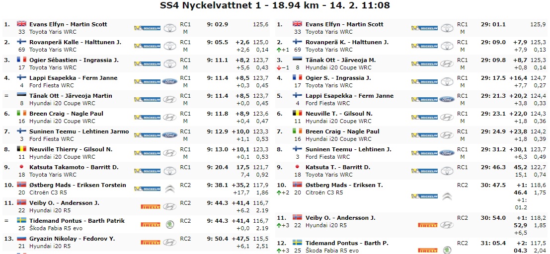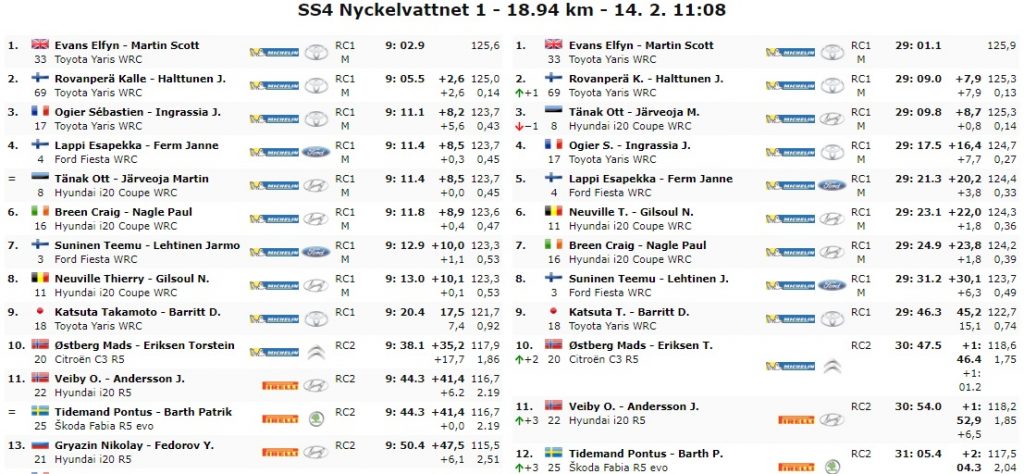 A staccare il miglior tempo è il driver estone Ott Tanak che si porta a soli due decimi dal britannico Elfyn Evans, terminato alle spalle del campione del mondo. Podio e conferma di esso nella generale per Kalle Rovanpera. Ancora quarto tempo per Seb Ogier, mentre Thierry Neuville perde un po’ di terreno (settimo tempo) appannaggio di Esapekka Lappi che lo scavalca nella generale.