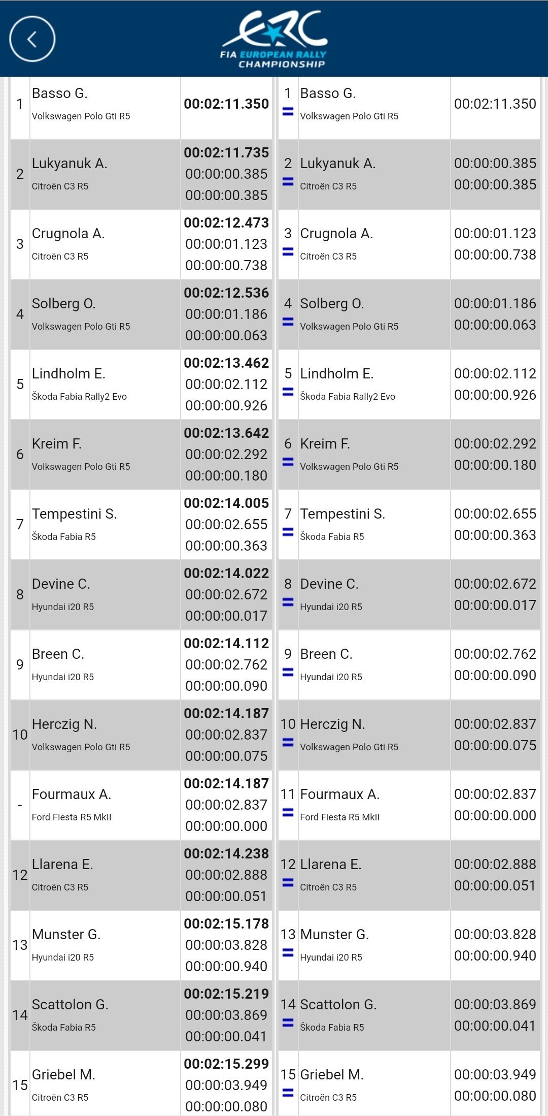 Buon quarto crono per Oliver Solberg (Volkswagen Polo GTi R5), che precede il finlandese Emil Lindholm (Skoda Fabia Rally2 Evo). Sesto tempo per il tedesco Kreim, settimo Tempestini, ottavo per Devine, nono per Craig Breen e decimo per Herczing.