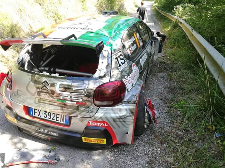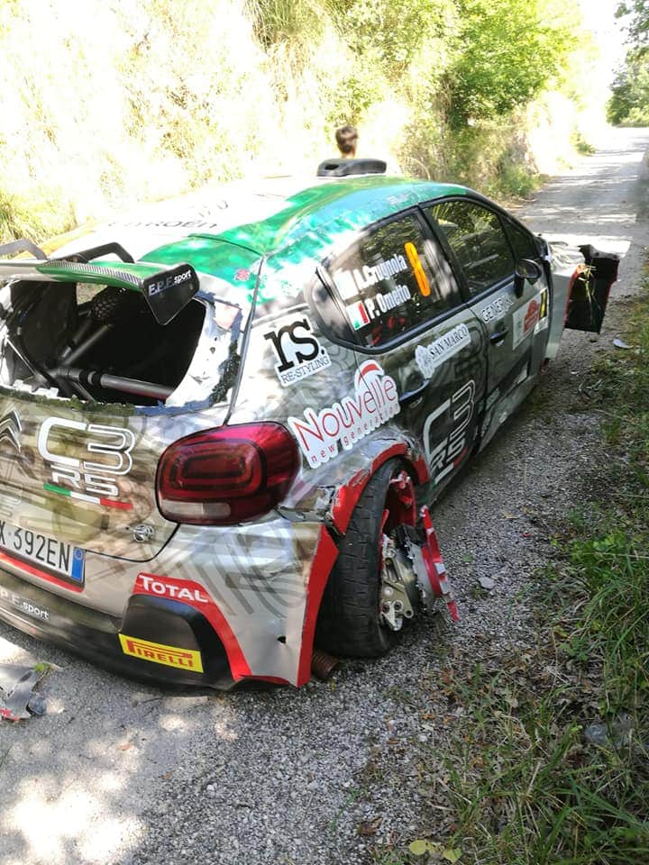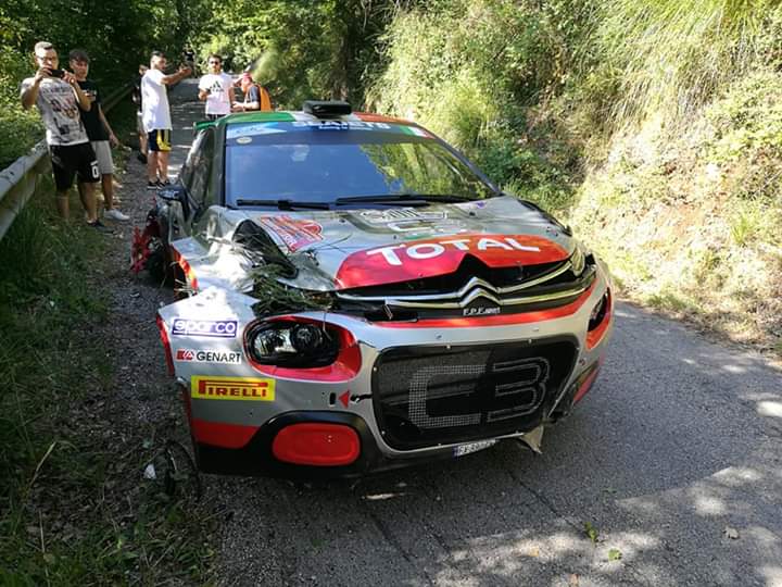 Nessun danno fisico fortunatamente per il duo, al via della gara capitolina con una Citroen C3 R5, ma vettura inutilizzabile per via di una ruota staccata e quindi conseguente ritiro.