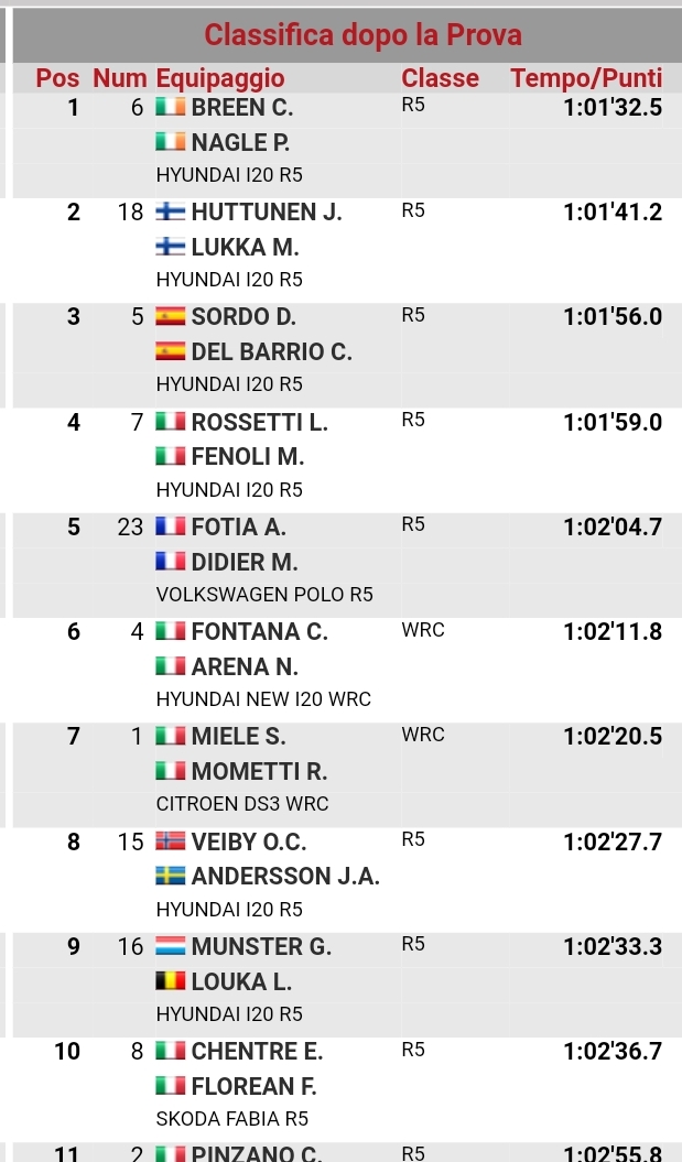 Il vincitore della gara è l’irlandese Craig Breen che sino all’ultima prova speciale ha condotto un passo gara davvero di alto livello, senza correre rischi e guidando con pulizia e maestria. Dietro di lui il finlandese Huttunen ha guidato davvero molto forte, vincendo anche la Ps7. Terzo posto molto battagliato fra Sordo, Rossetti e Fotia, ma alla fine l’ha spuntata il driver spagnolo