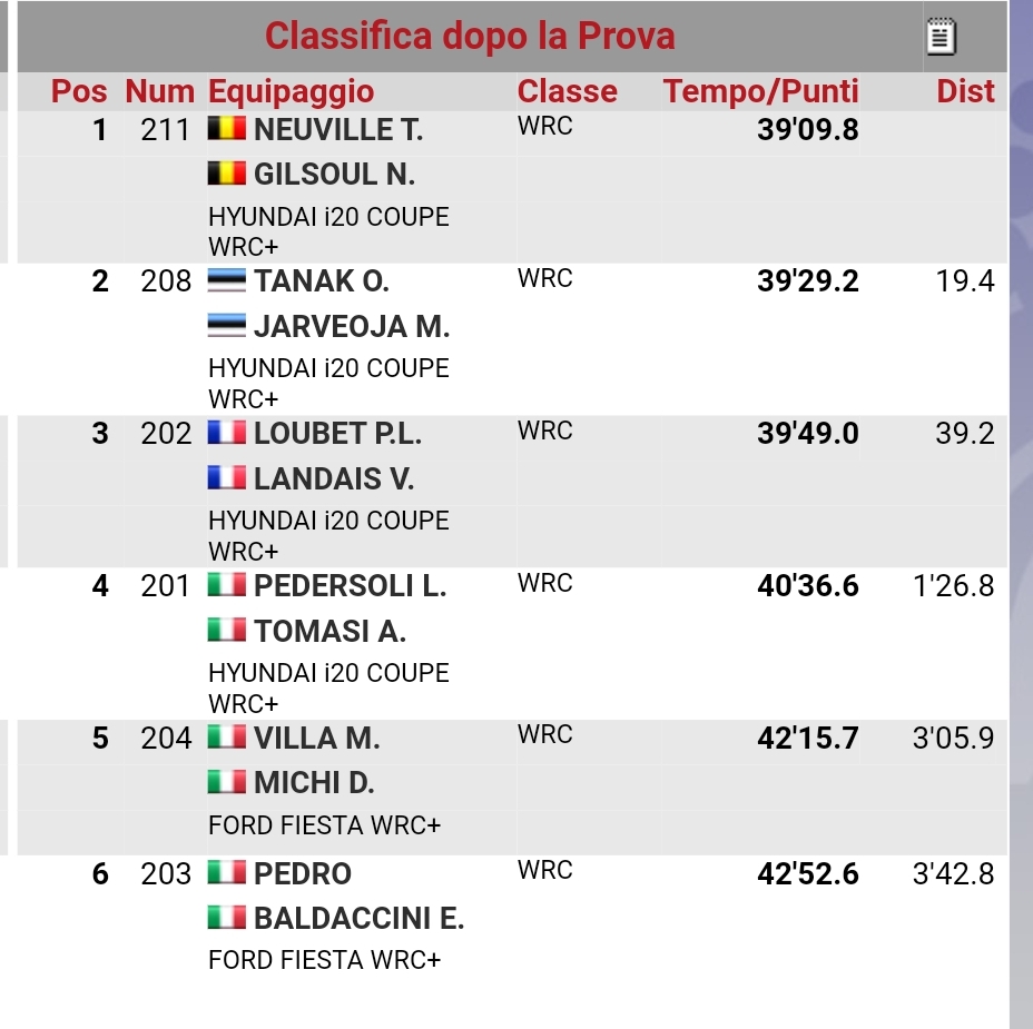 Nessun grande colpo di scena ne per quanto concerne i tempi e ne per quanto concerne le posizioni in classifica dove troviamo i due ufficiali Hyundai davanti ad un super Pierre-Louis Loubet che si sta comportando molto bene alla sua sola seconda gara su una Wrc+.