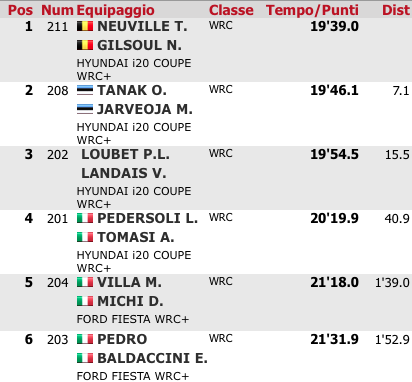 La classifica provvisoria vede quindi in testa Neuville con 7” di vantaggio su Tanak. Loubet è leggermente più staccato e accusa circa 15” di ritardo dal leader. Pedersoli sempre al comando fra gli italiani, con Villa che precede “pedro”.