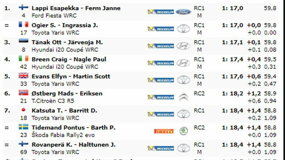 Nei 1.28 chilometri cronometrati di Tartu, il miglior tempo staccato è un ex aequo tre Sebastian Ogier (Toyota Yaris WRC) ed Esapekka Lappi (Ford Fiesta WRC), che fermano il cronometro sul 1’17″00.