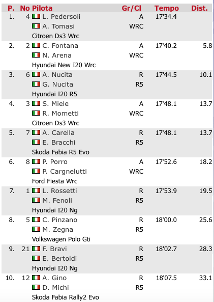 Pedersoli dopo le due prove disputate comanda quindi la generale con 5.8 secondi su Fontana e 10.1 su Nucita. PiĂą staccati Miele e Carella entrambi a 13.7 secondi, mentre in sesta piazza troviamo Paolo Porro con la Fiesta WRC a 18.2 secondi.