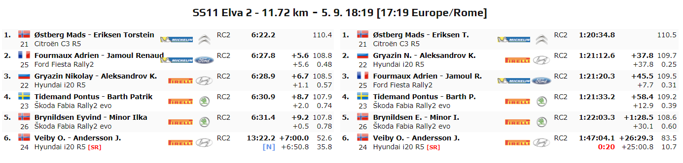 A comandare tuttavia a fine day 2, è Mads Ostberg che alla guida della Citröen C3 R5 ha condotto una gara fin qui senza sbavature. Qualche avvicendamento al comando, prima Veiby poi rallentato da forature e in un secondo momento Adrien Formaux, non hanno comunque fermato la cavalcata del forte pilota norvegese.
