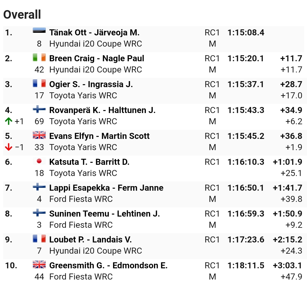 In quarta piazza troviamo il finlandese a bordo della Yaris Wrc+ Kalle Rovanpera che nonostante la foratura di stamattina è comunque riuscito a risalire posizioni importanti nel corso della gara, mentre conclude quinto Evans, anche lui vittima di problemi come annunciato poc’anzi. Sesto un ottimo Takamoto Katsuta, oramai pilota consolidato nella categoria Wrc+ che ha segnato buonissimi tempi sino a qui, mentre concludono la top10 a fatica le Ford Fiesta di Lappi e Suninen che non hanno mai segnato buoni tempi, la Hyundai i20 di Loubet che matura esperienza sulla vettura e l’altra Ford Fiesta di Gus Greensmith, prima volta per lui in Estonia.