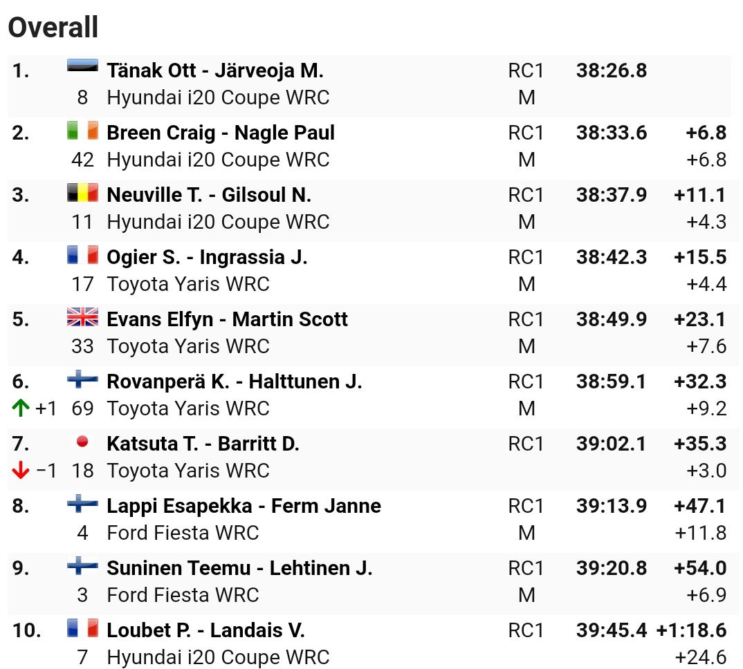 È lui il pilota di casa e vuole questa vittoria più di ogni altra cosa per riconfermarsi ancora una volta di essere il migliore. Ott Tanak segna il miglior tempo davanti ai compagni di squadra Breen e Neuville.