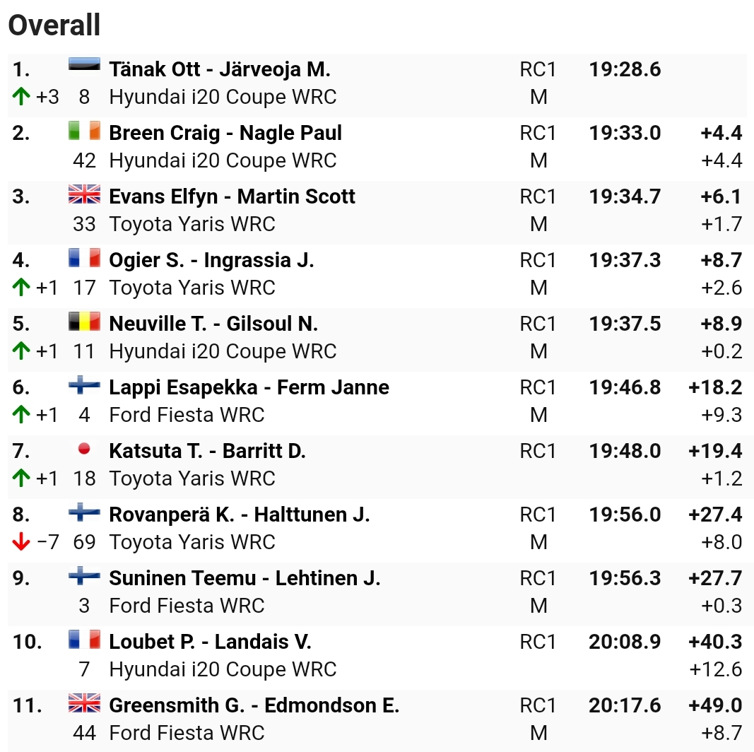 Dietro al terzetto si posiziona col quarto tempo Thierry Neuville davanti al francese Ogier, che sembra non aver feeling giusto con la macchina in questi primi chilometri di gara. Col sesto tempo un gran tempo quello del giapponese Takamoto Katsuta, in grande crescita con questo bolide chiamato Yaris Wrc+, alla sua quinta gara mondiale con essa. Chiudono la top10, Lappi, Suninen, Loubet e Greenismith.