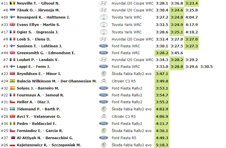 Alle spalle del duo Hyundai, troviamo i tre alfieri di casa Toyota, Kalle Rovanpera, Elfyn Evans Sébastien Ogier separati da loro da appena tre decimi di secondo. Sesto tempo per il rientrante Sébastien Loeb con la terza Hyundai I20 WRC in gara.