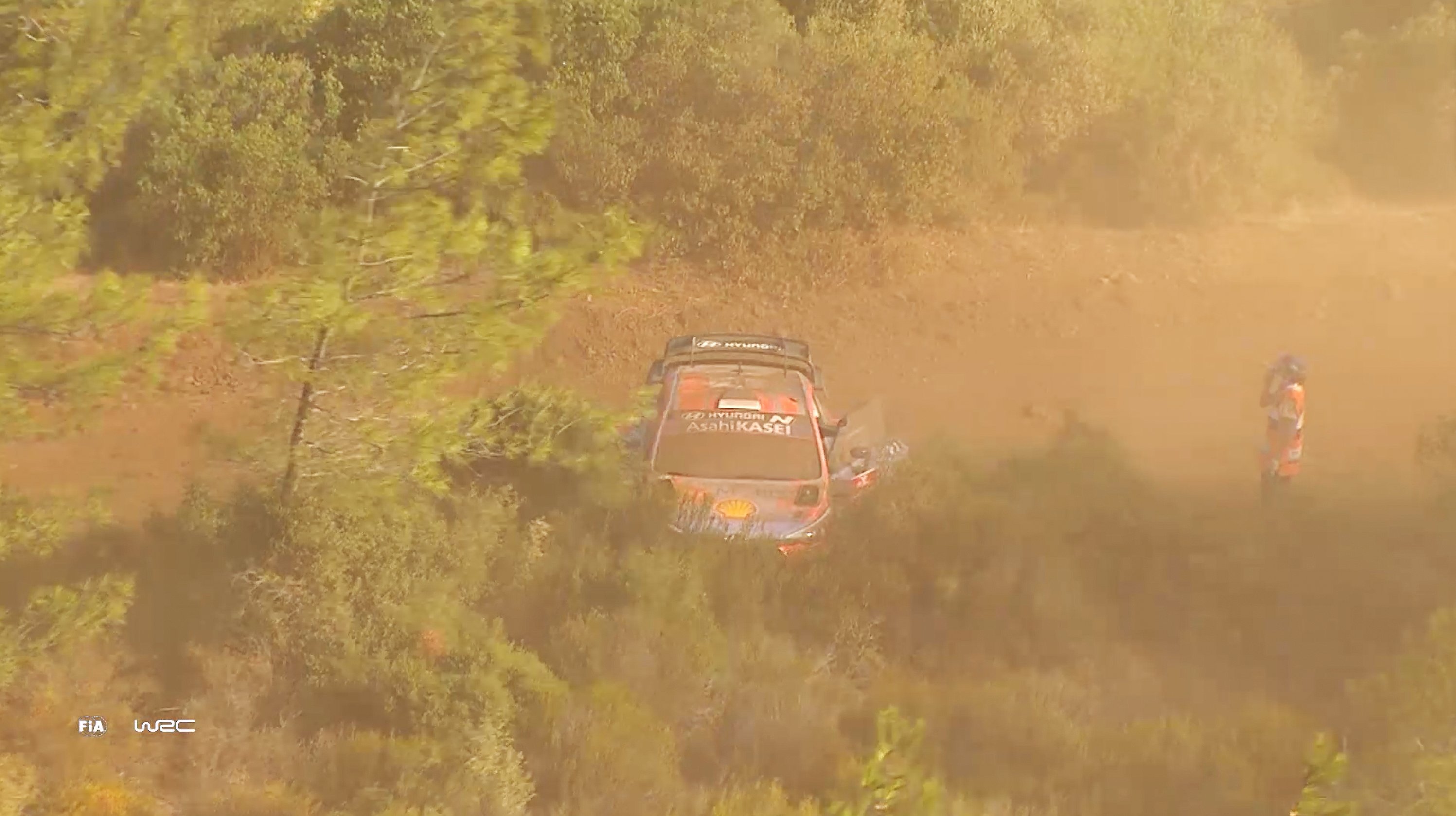 Prima prova della mattina e primo incredibile imprevisto. Le immagini del camera car mostrano un anomalo comportamento della macchina che al km 25 della terza speciale, improvvisamente vira a sinistra in pieno rettilineo, fermandosi di traverso sul terrapieno.