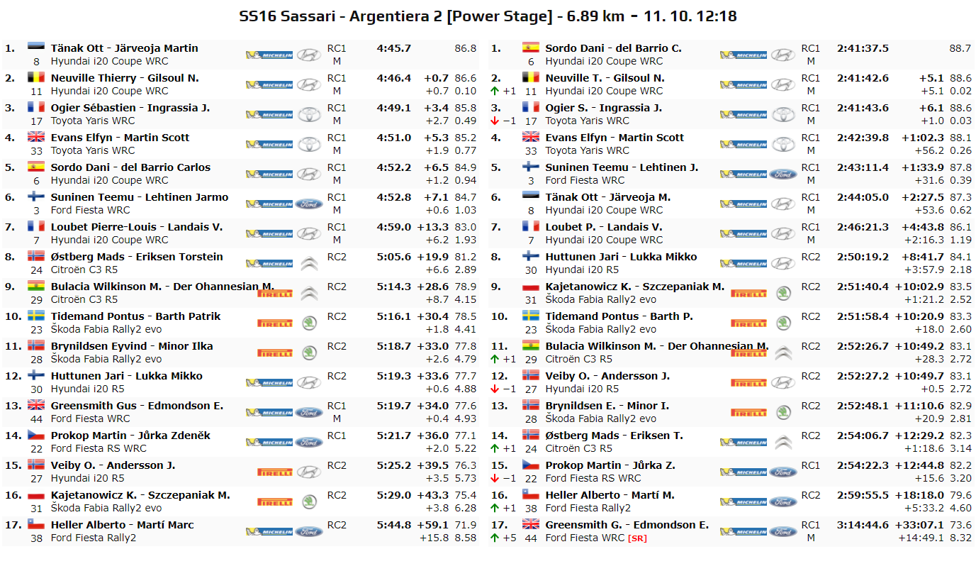 La zampata di Thierry Neuville. Il belga, arrembante già nelle speciali precedenti, sopravanza Sébastien Ogier al secondo posto grazie ad un tempo monstre nella power stage. Tuttavia la vittoria parziale della prova va a Ott Tanak, piccola consolazione di un weekend da dimenticare. Terzo quindi nella power stage e nel rally, Sébastien Ogier.