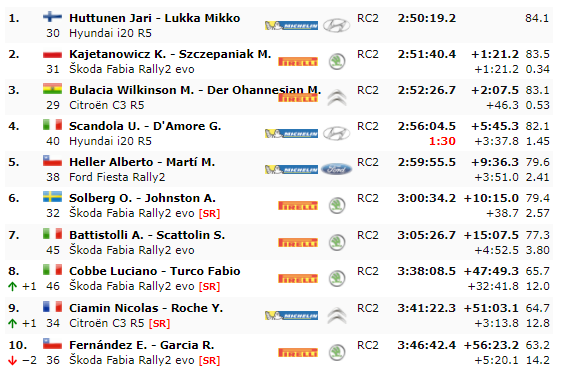 Ottima quarta piazza per Umberto Scandola (Hyundai I20 R5), mentre in quinta posizione troviamo il cileno Alberto Heller (Ford Fiesta rally2). Solo sesto Oliver Solberg (Skoda Fabia rally2), mentre la settima e l’ottava posizione sono ad appannaggio di Alberto Battistolli e Luciano Cobbe.