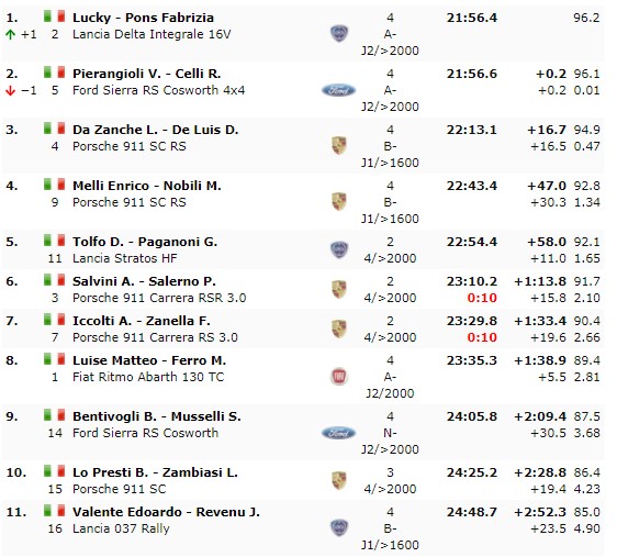 Nel primo raggruppamento comanda Cesare Bianco (Lotus Elan), il secondo raggruppamento vede al comando Dino Tolfo (Lancia Stratos HF), il terzo raggruppamento Beniamino Lo Presti (Porsche 911 SC), mentre il quarto vede comandare le operazioni Lucky. Per quel che riguarda il Trofeo A112, comanda Marco Gino Dell’Avo, mentre il leader del campionato Domenighini è stato costretto al ritiro per cedimento meccanico.