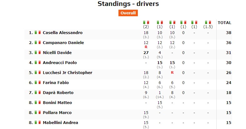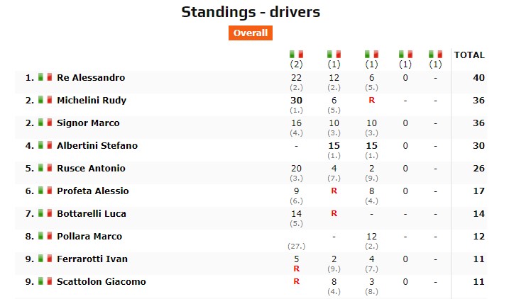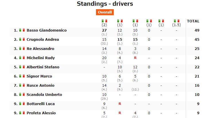 Dopo le prime sei gare (considerando il Sanremo non disputato), al comando troviamo Giandomenico Basso (VW Polo GTi R5) con 49 punti, seguito ad appena quattro lunghezze dal varesotto Andrea Crugnola. L’alfiere F.P.F è reduce da tre successi di fila è al contrario dei suoi avversari ha già uno scarto da effettuare (lo 0 al Roma Capitale – gara1). Terza posizione in classifica per Alessandro Re con 25 punti, seguito da Rudy Michelini a 24 punti e Stefano Albertini a 22 punti.