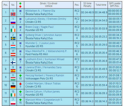 Ps 4 Fòny – Ohuta 1, vede ancora trionfare il norvegese Mikkelsen davanti a Lukyanuk, divisi ancora di un niente mentre terzo giunge ancora Breen, stesso ordine di arrivo della prova speciale precedente. Solberg in crescita nonostante il testacoda conclude col quarto tempo davanti a Marczyk (vincitore della PS1 ieri) e l’ungherese Herczing. Ancora tanta fatica per Munster che paga una scelta di gomme errate, si posiziona nelle retrovie e adesso il divario fra le prime posizione inizia ad intensificarsi. Come anticipato poc’anzi la prova speciale presenta molto fango, fattore che ha compromesso (oltre al lussemburghese Munster) i tempi di LLarena, Dinkel e Cais.