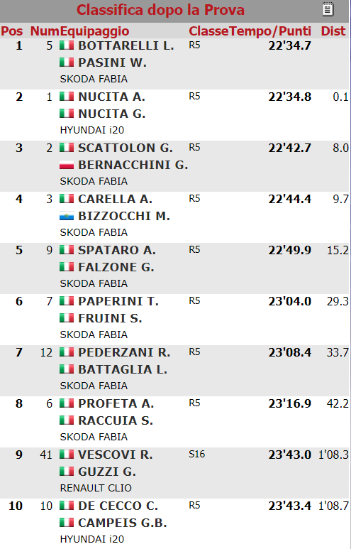 Per quanto riguarda invece la Supercoppa Wrc Italia, davanti a tutti troviamo il fresco vincitore del CIWRC, Corrado Fontana che alla guida della fida Hyundai i20 WRC, comanda su Puricelli e Luigi Fontana.