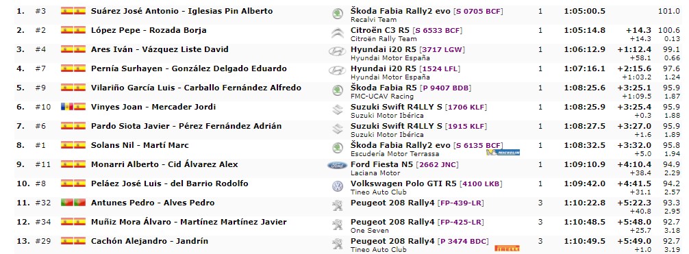 Buona la prestazione di Surhayen Pernia (Hyundai I20 R5) che conclude quarto, mentre chiude la top five la Skoda Fabia R5 di Luis Garcia Villarino. Gara da dimenticare per i fratelli Solans, Nil chiude in ottava piazza, rallentato da una foratura che gli fa perdere oltre tre minuti, mentre Jan esce di strada sull’ultima speciale del rally (poi annullata), vanificando di fatto l’ottima gara fatta fin a quel momento, caratterizzata anche da uno scratch.