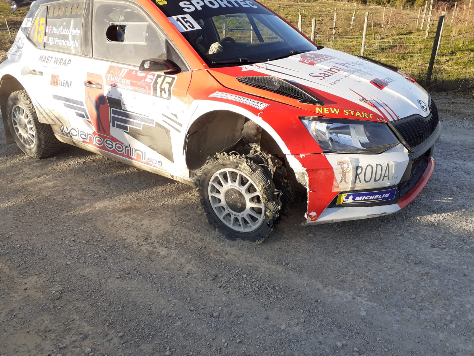 All’arrivo della PS7 due degli stranieri scesi in Toscana per ‘imparare’ gli sterrati nostrani arrivano al controllo stop con le ‘scarpe’ a terra.