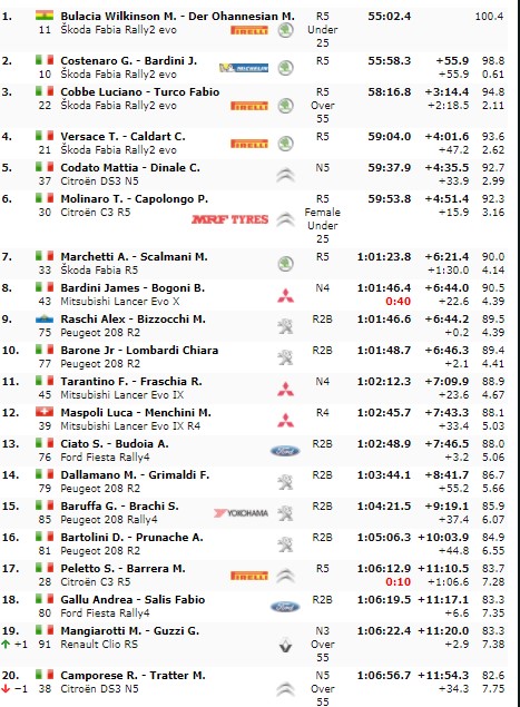 Alle spalle di Bulacia e Costenaro, chiude Luciano Cobbe con Fabio Turco (Skoda Fabia rally2), quarto posto per Tullio Versace (Skoda Fabia rally2) e splendida quinta piazza per Mattia Codato su Citroen DS3 N5.