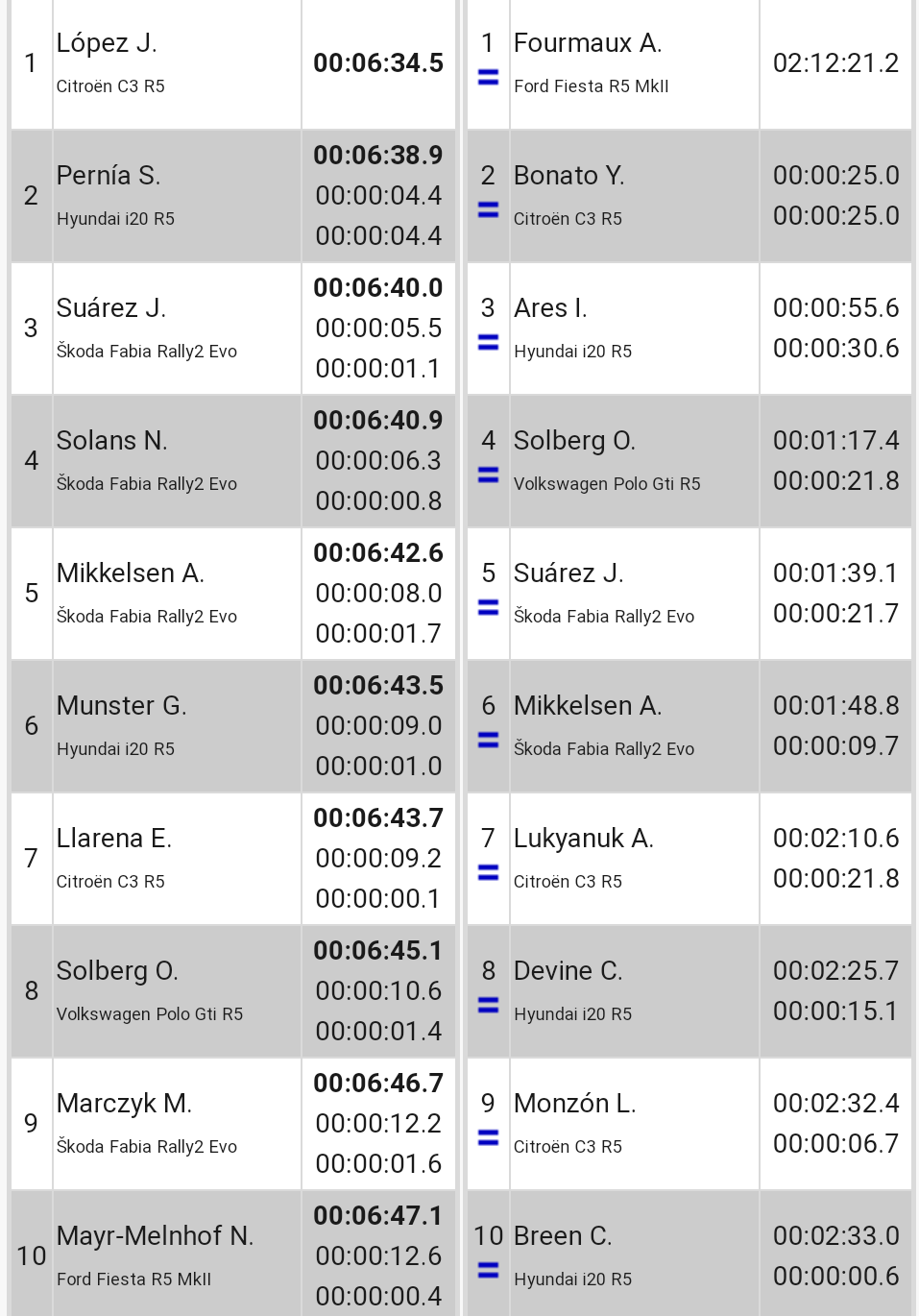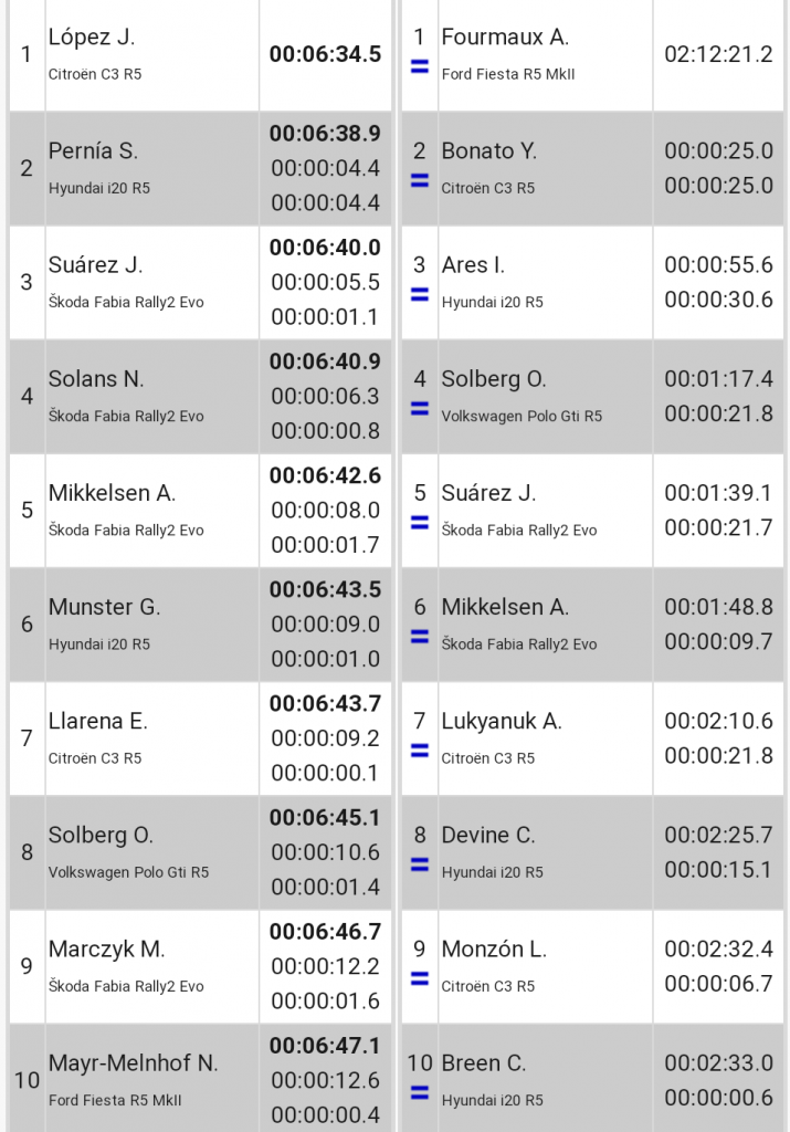 Quinto e sesto posto per le due Skoda Fabia Rally2 Evo di Jose Suarez e Andreas Mikkelsen, quest’ultimo autore di una gara al di sotto delle aspettative e costretto ad una furibonda rimonta che gli ha permesso di rientrare nella top five. Al settimo posto ha chiuso Alexey Lukyanuk, navigato da Alexey Arnautov su Citroen C3 R5. Il forte pilota russo con questo risultato si è garantito la conquista del suo secondo titolo europeo, dopo quello conquistato nel 2018 al volante della Ford Fiesta. Il driver della Citroen ha ammesso con sincerità che in questa gara avrebbe potuto fare di meglio, però alcuni errori uniti ad un’errata scelta degli pneumatici l’hanno costretto a navigare nella parte bassa della top ten, per poi guadagnare qualche posizione nel finale. Un titolo sicuramente meritato e a dimostrazione di ciò ci sono le due splendide vittorie ottenute durante l’anno al Rally di Roma Capitale e in Portagallo. Chiudono i primi dieci Callum Devine (Hyundai I20 R5), Luis Monzon (Citroen C3 R5) e Craig Breen (Hyundai I20 R5).