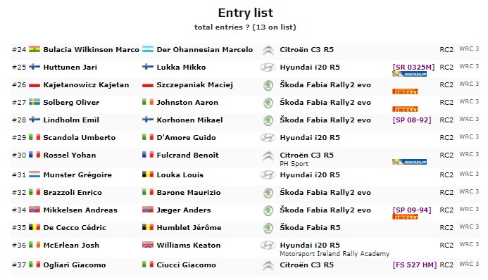 Tre gli italiani al via, Umberto Scandola-Guido D’Amore (Hyundai I20 R5), il rientrante Enrico Brazzoli-Maurizio Barone (Skoda Fabia rally2) e il debuttante Jack Ogliari-Giacomo Ciucci (Citroen C3 R5).